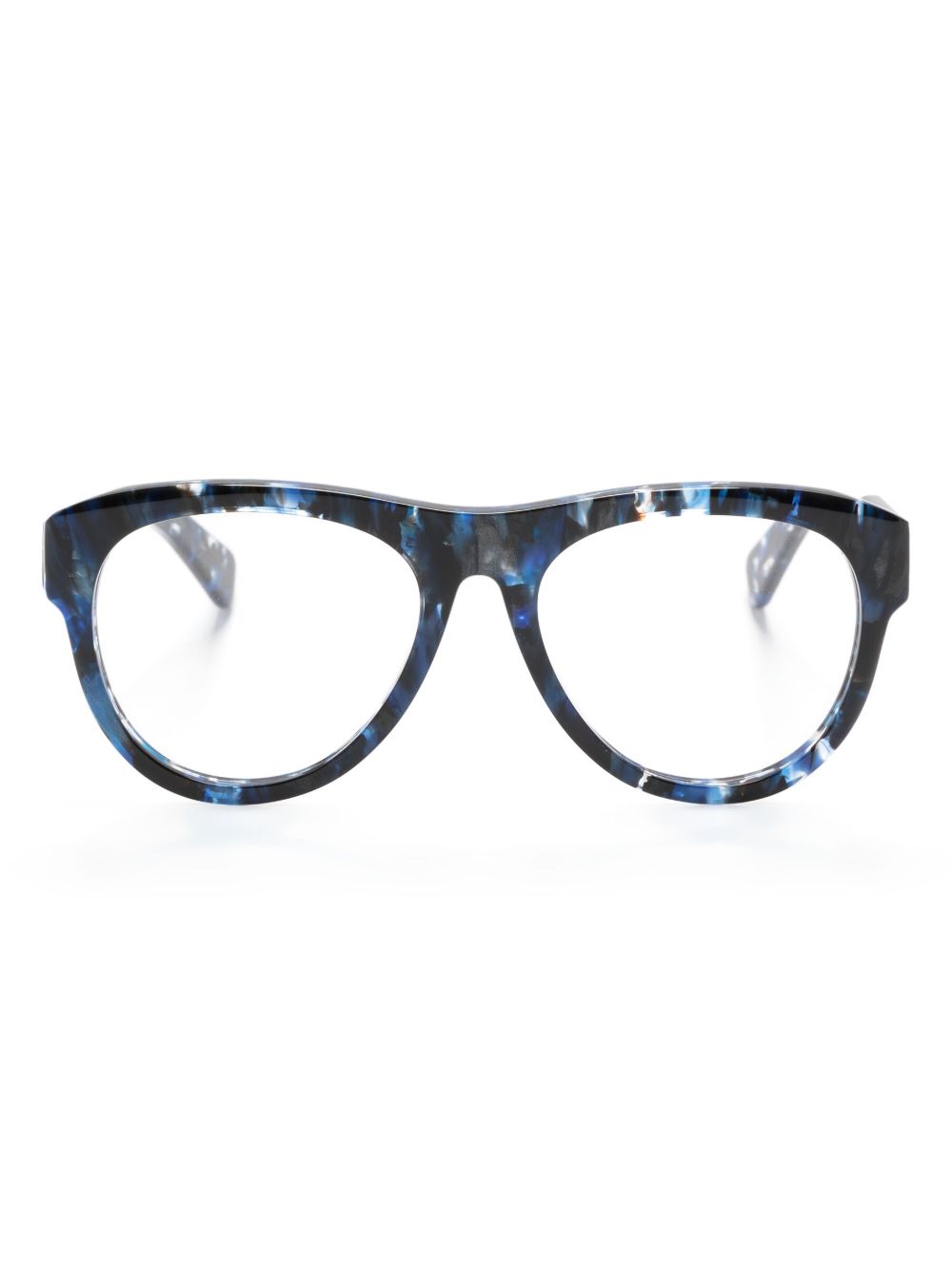 蓝色、醋酸纤维、镜腿饰有logo印花、大面积图案印花、圆框、透明镜片、直镜腿、带弧度镜脚套。这款商品随附保护盒。FARFETCH 所有眼镜均不设验光镜片。