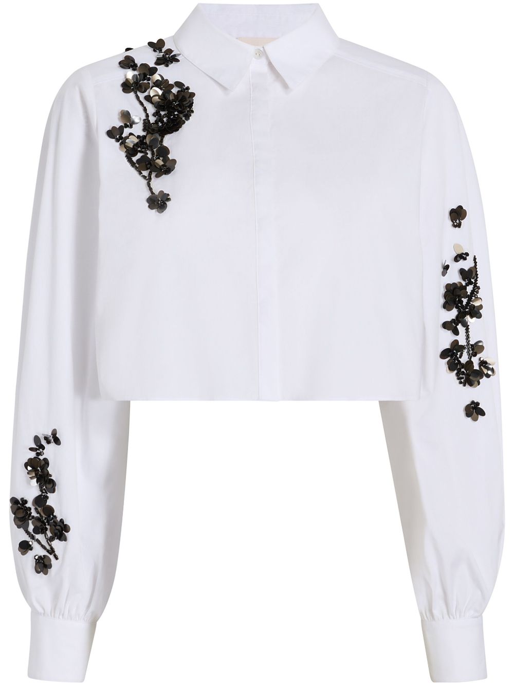 白色/黑色 弹性棉质 亮片镶嵌 经典领 正面饰有隐藏式纽扣 长袖 搭扣袖口 平直下摆 短款