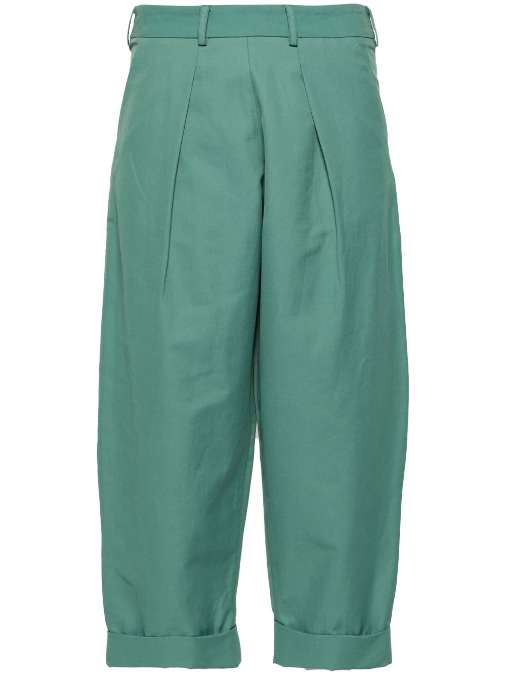 祖母绿色 棉 交扣斜纹布编织 褶饰细节 背面饰有数字刺绣 高腰 腰带袢 后置隐藏式拉链 两侧饰有插袋 后置两个平袋 阔腿 露踝