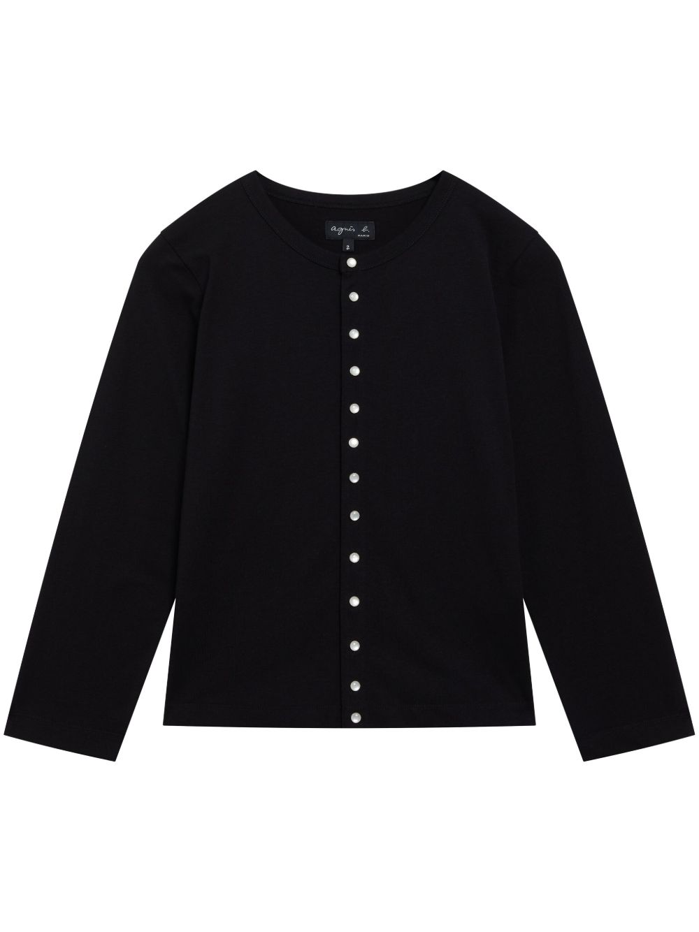 黑色 棉 圆领 正面纽扣 长袖 平直下摆