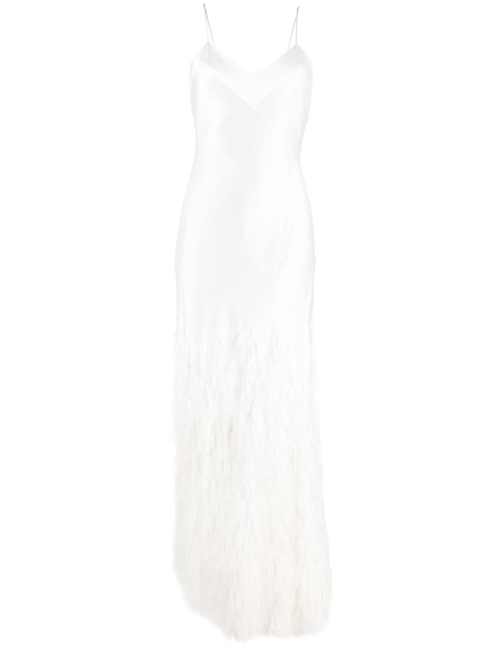 米白色、真丝、鸵鸟毛、缎面效果、羽毛细节、V领、细肩带、长款。