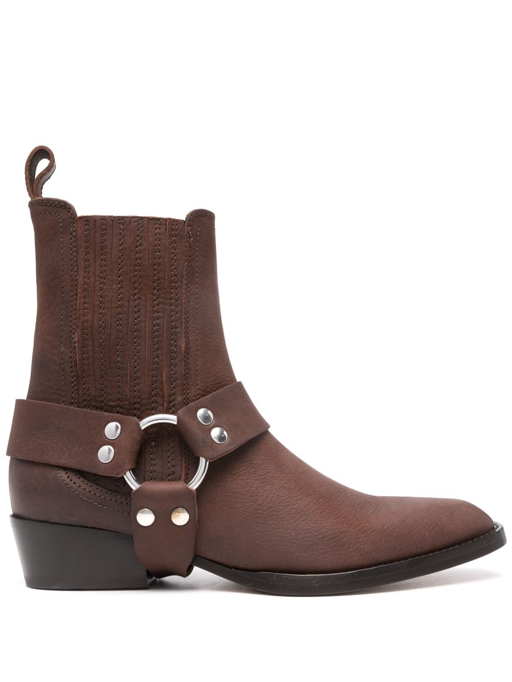 咖啡色 小牛皮 饰带细节 环形五金配件 铆钉细节 银色五金配件 套穿式 尖头 侧面饰有弹性拼接 背面提鞋环 皮质衬里 古巴跟