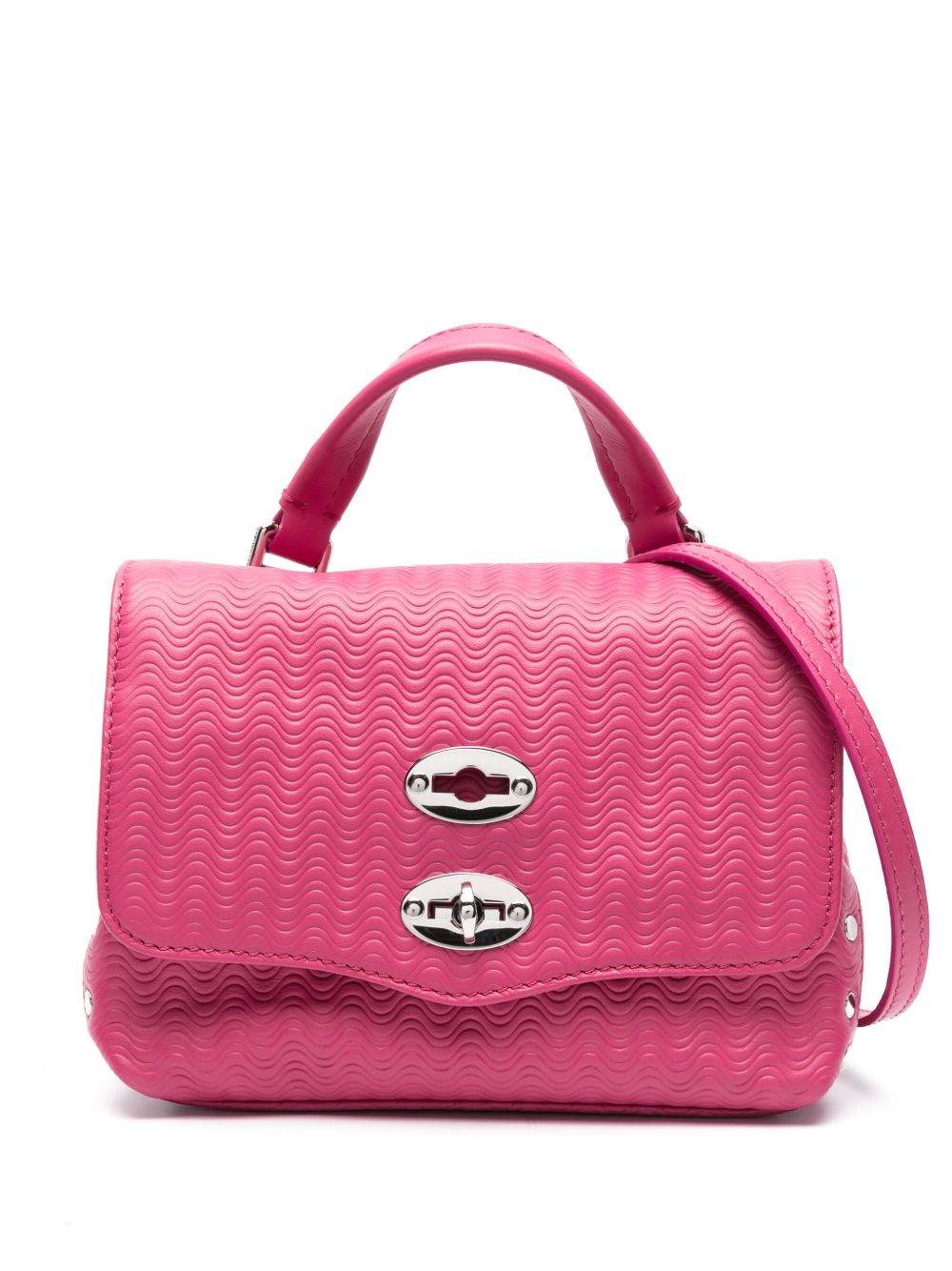 玫粉色、银色铆钉细节、金属脚钉、波浪印花、内置logo贴花、单个顶置平手柄、顶部翻盖、旋扣、内置插袋、可调式肩带。