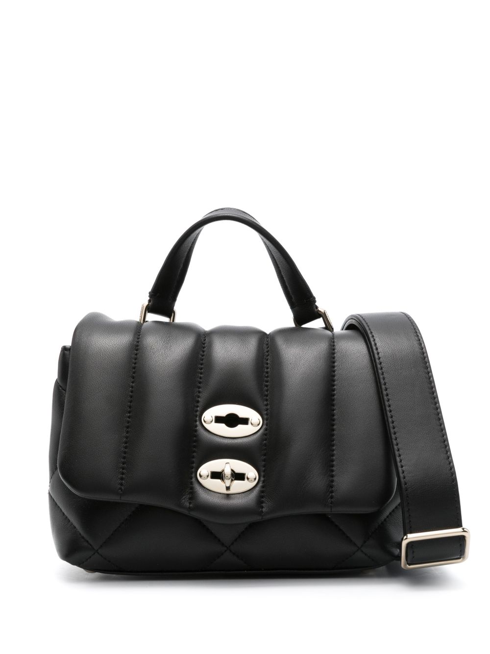 黑色 小牛皮 光滑粒纹 方形 一个平顶手柄 可调可拆卸肩带 条纹和菱形绗缝 金属脚钉 主夹层 内置logo标记 内置贴袋 对比衬里 金色五金配件 翻盖饰有旋扣