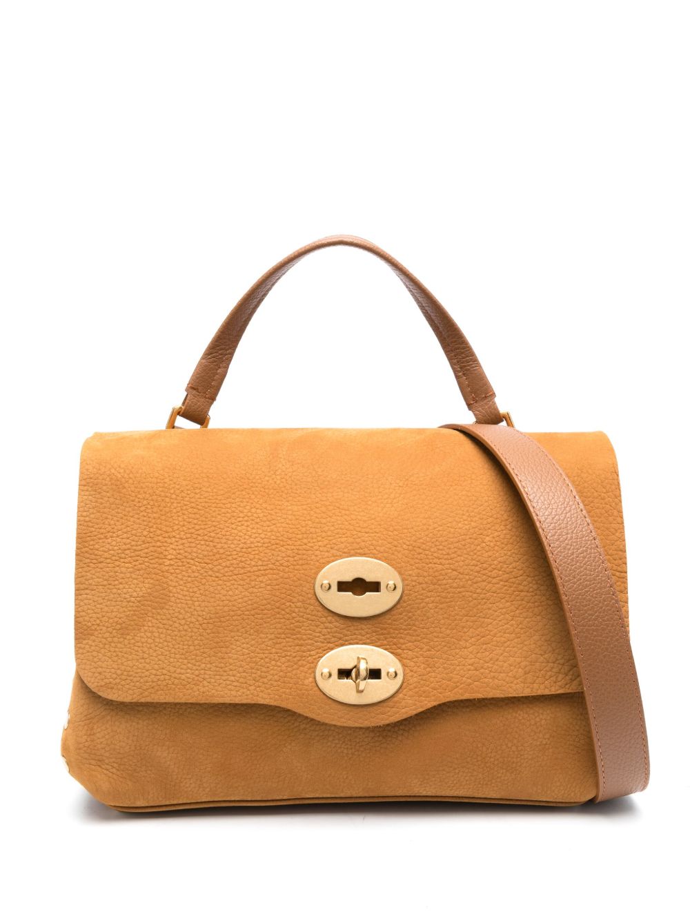 驼棕色、绒面小牛皮、金色五金配件、铆钉细节、金属脚钉、内置logo贴花、顶部翻盖、旋扣、手柄、可拆卸肩带、分区隔层、内置拉链口袋。