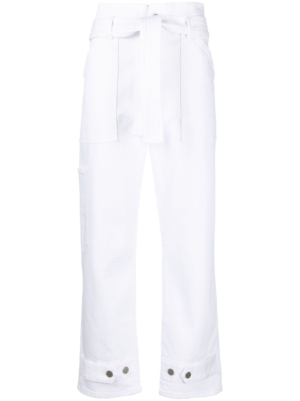 设计细节:白色、纸袋式裤腰、系腰带设计、直筒、正面纽扣、两个侧置插袋。