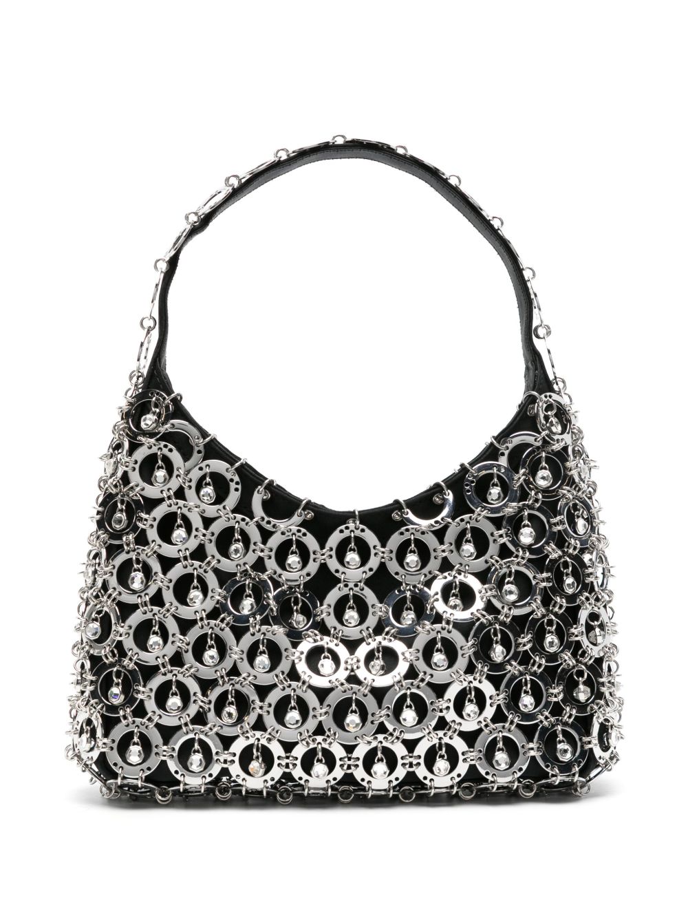 黑色/银色 缎面光泽 水钻镶嵌 圆形锁子甲细节 单肩 顶置拉链 主夹层 内置logo标牌 内置插袋 银色五金配件 全衬里 这款商品随附防尘袋。