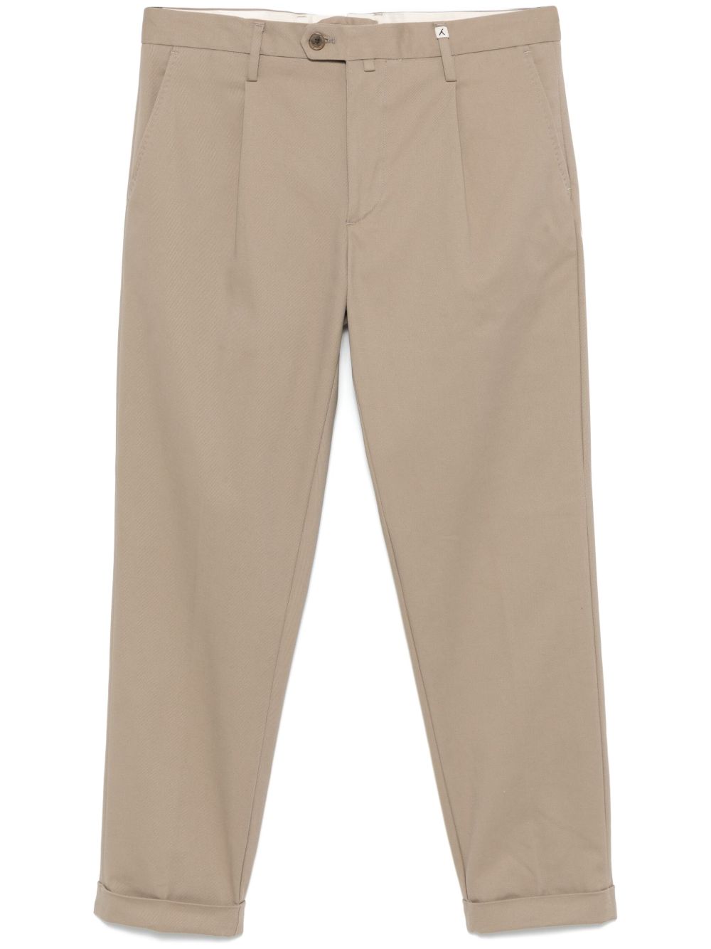 灰褐色 棉质混纺 斜纹织物 正面饰有纽扣与拉链 腰带袢 logo吊牌 正面褶饰细节 压褶 两侧饰有插袋 省道细节 背面两个搭扣口袋 卷边 锥形裤腿