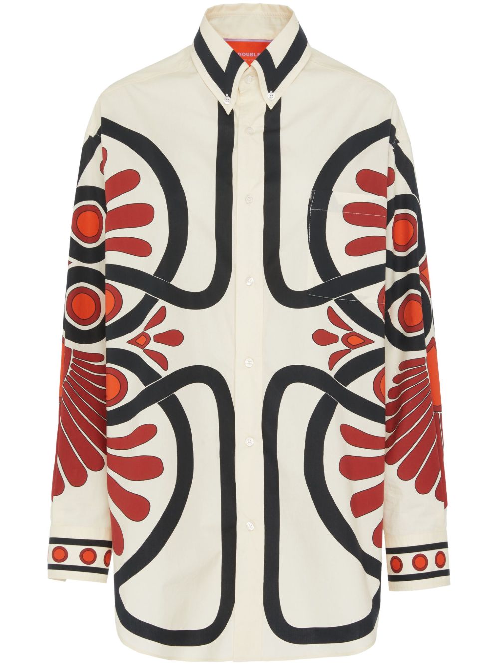 乳白色 棉 几何印花 扣角领 正面纽扣 胸前饰有两个贴袋 长袖 弧形边