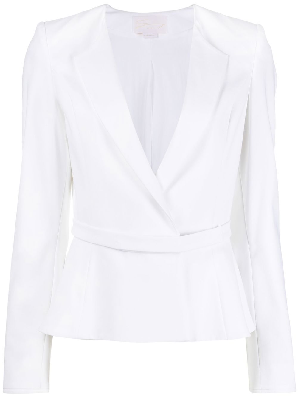 白色、棉丝混纺、精裁设计、荷叶边下摆、长袖、V领、经典翻领、系腰带设计。
