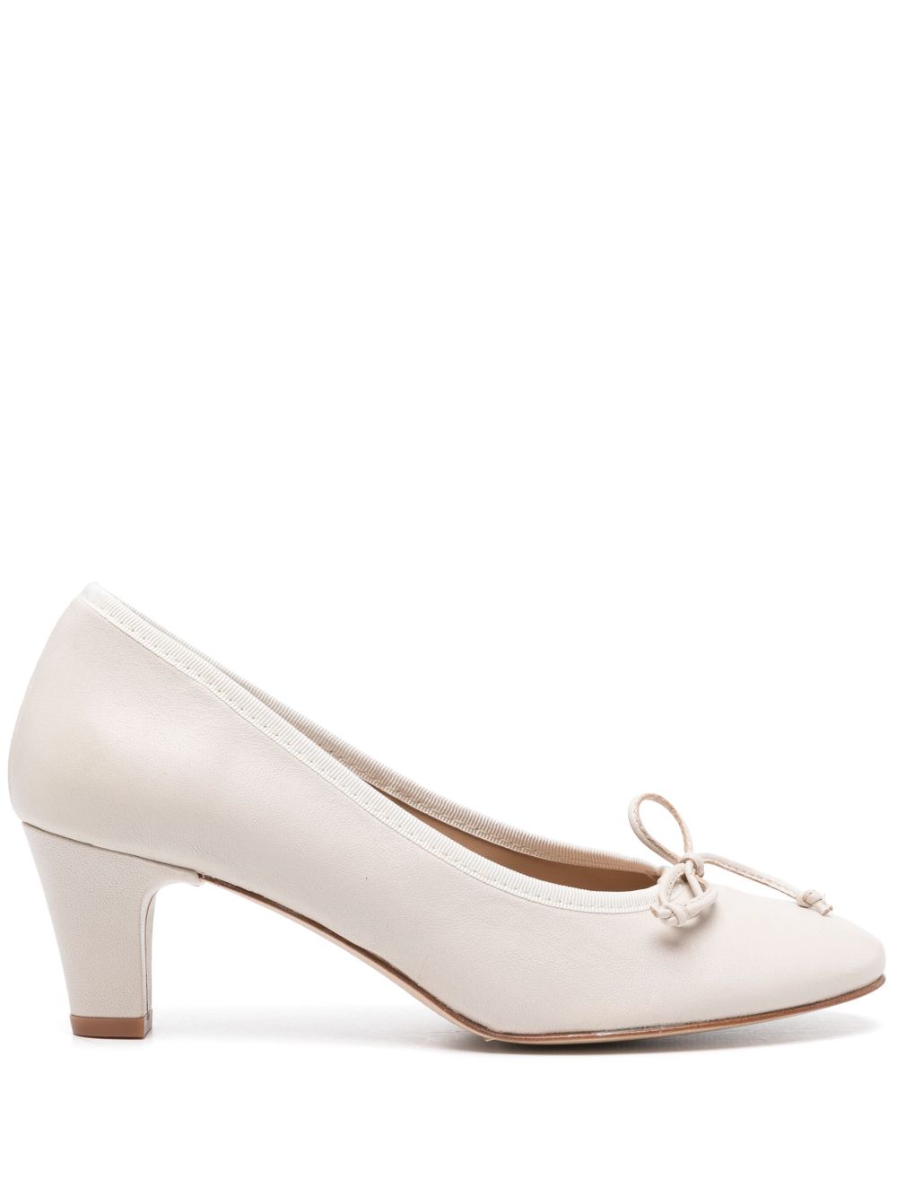 浅米色 小牛皮 光滑粒纹 穿套式 4.5厘米粗跟 蝴蝶结饰 圆头 logo皮质鞋垫 皮质底