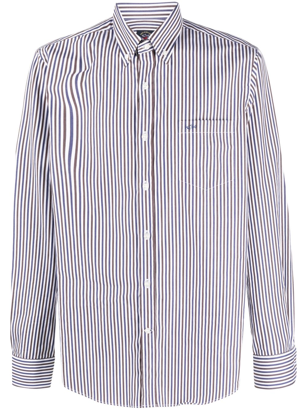 白色和多色、棉、多向条纹图案、胸前饰有logo印花、经典领、正面纽扣、长袖、搭扣袖口、弧形边。