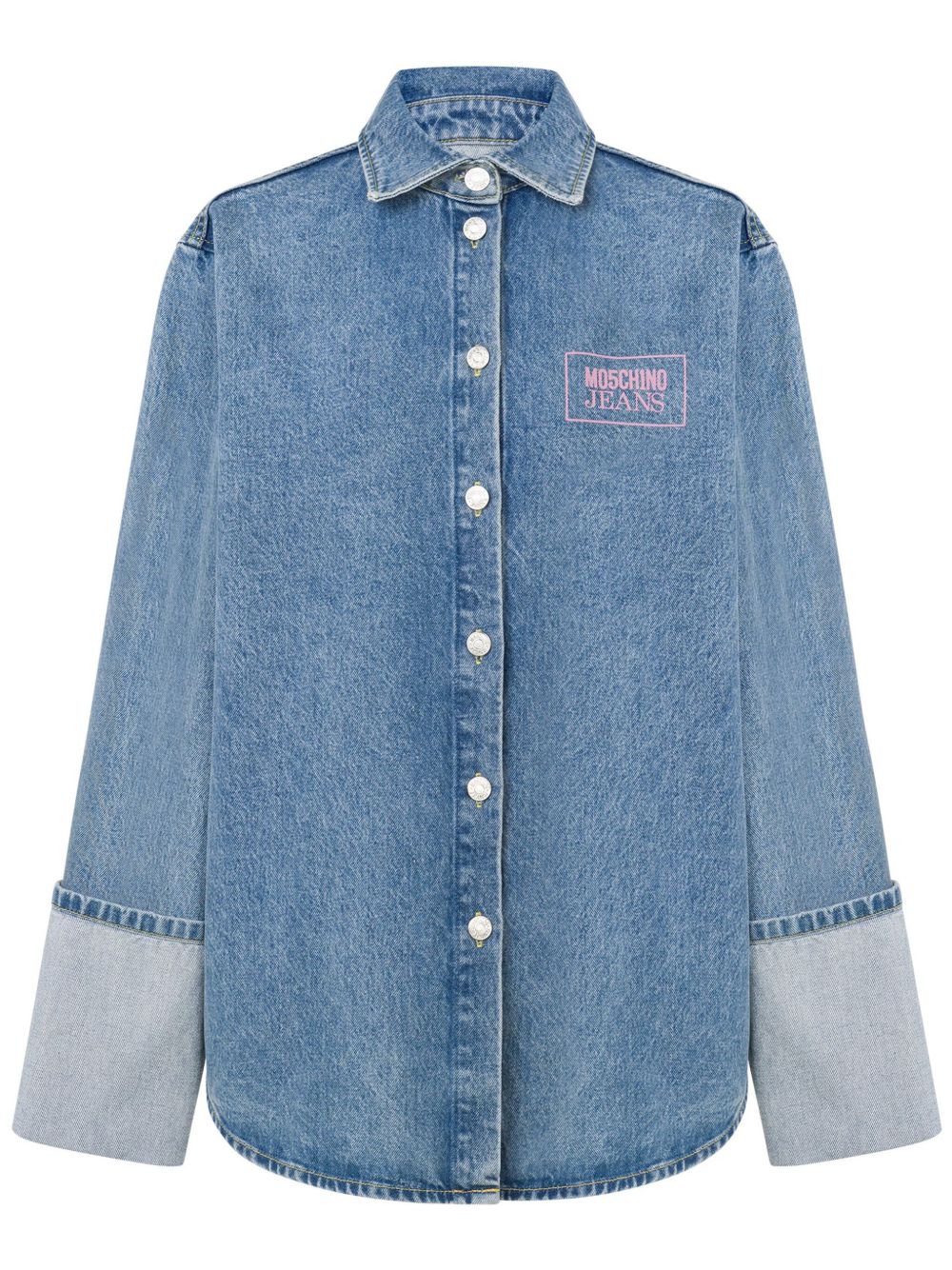 蓝色 棉 水洗效果牛仔 胸前饰有logo印花 正面纽扣 宽领 长袖 上翻袖口 弧形边