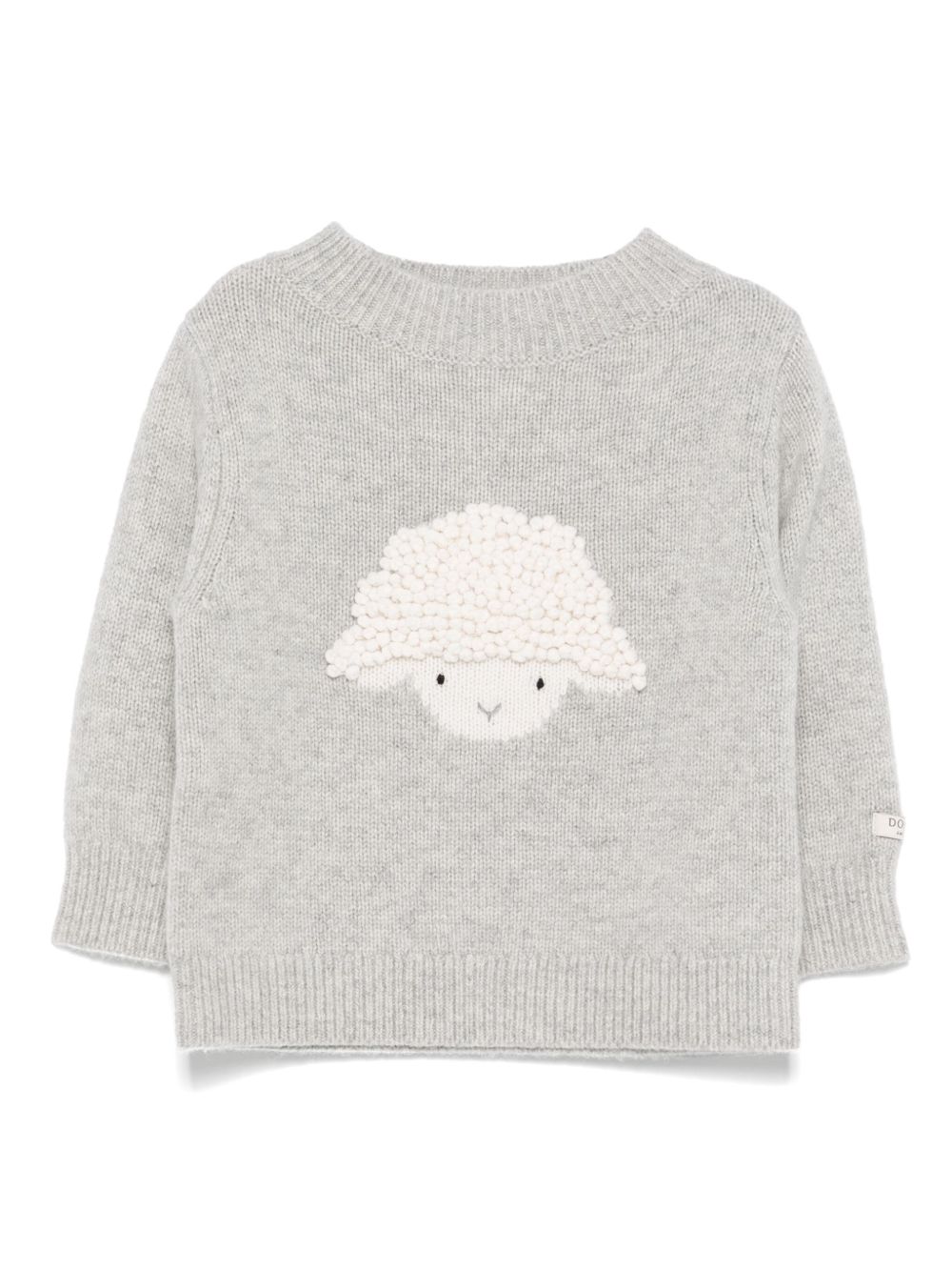 浅灰色 美利诺羊毛 针织面料 混色效果 罗纹圆领 长袖 衣袖饰有logo吊牌 正面饰有绵羊刺绣 贴花细节 罗纹袖口和下摆