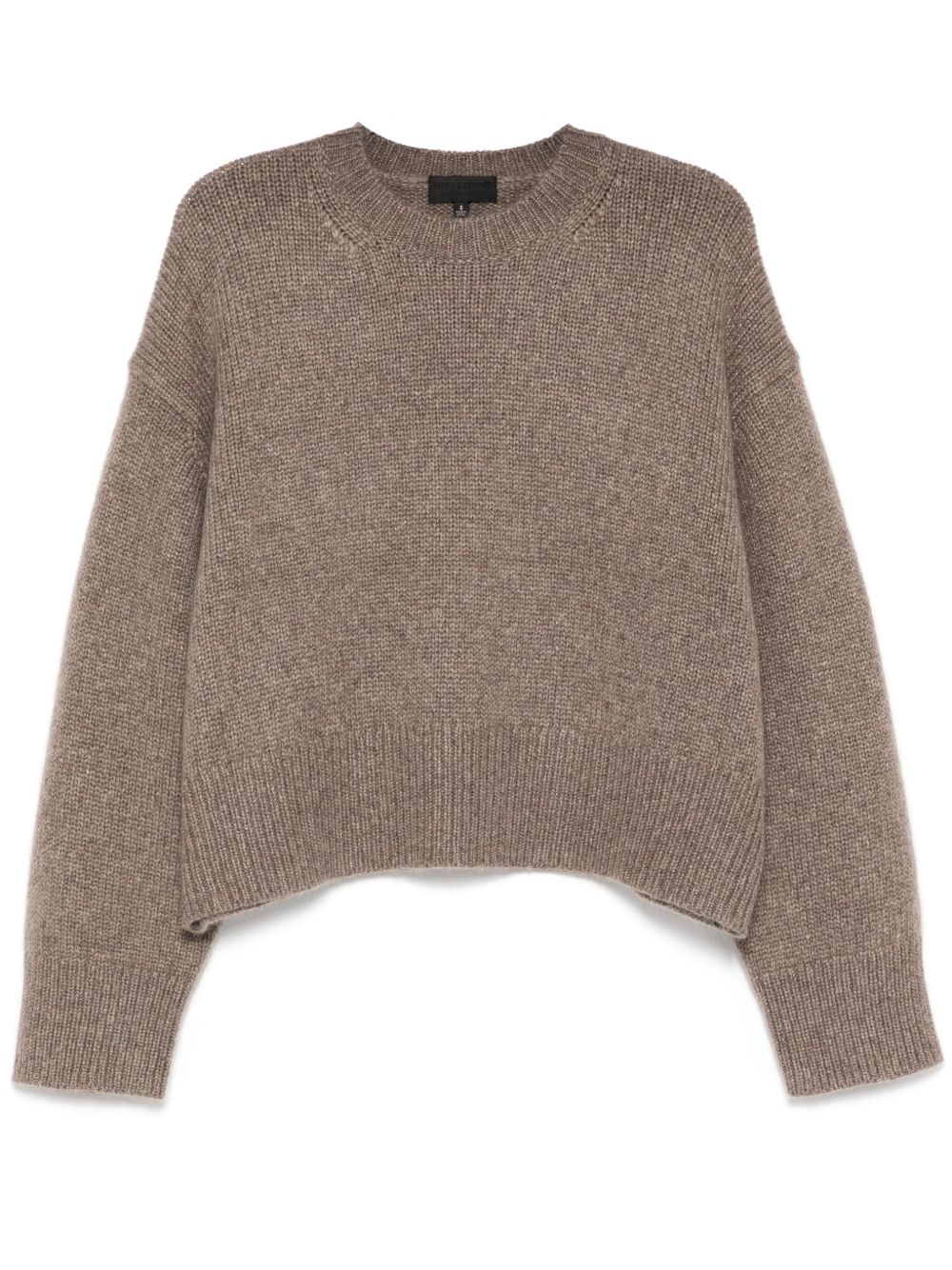 泥炭混色 羊绒 针织面料 混色效果 圆领 长袖 落肩 罗纹袖口和下摆 平直下摆