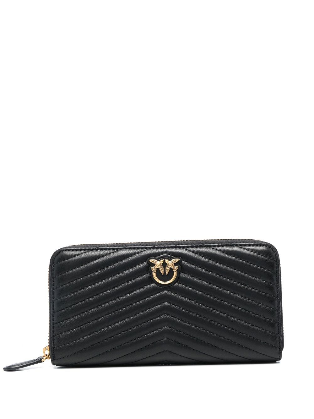 黑色、小牛皮、人字纹绗缝、金色logo标牌、环绕式拉链、内置卡槽。