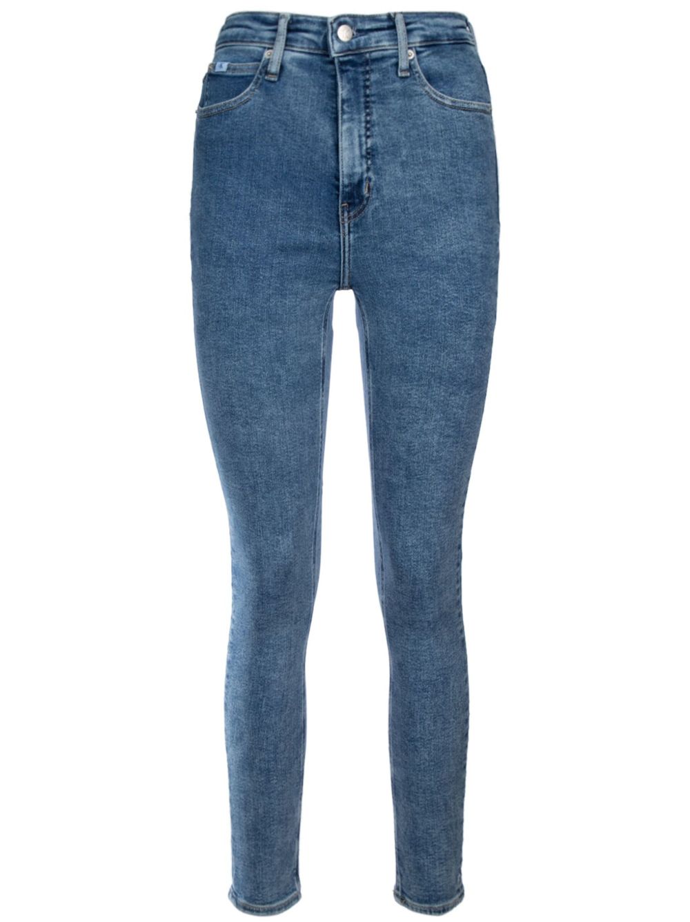 靛蓝色 弹性棉质 水洗效果牛仔 隐藏式拉链纽扣开合 高腰 腰带袢 铆钉细节 经典五口袋 贴花logo 紧身剪裁