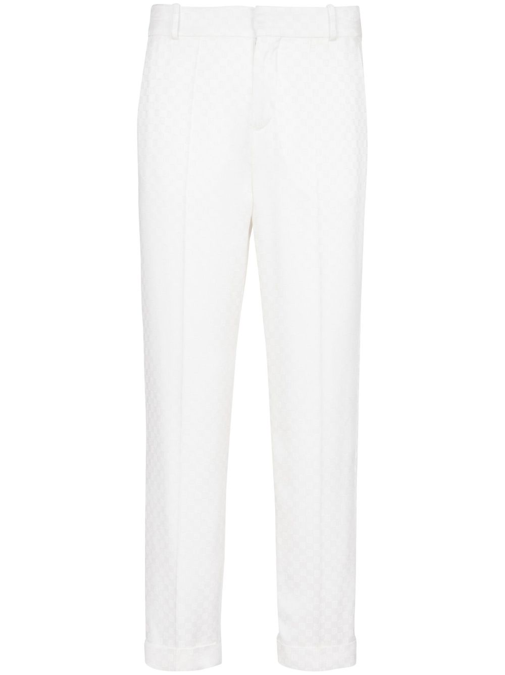白色、经典logo花纹、直筒、正面饰有隐藏式开合、腰带袢、压褶、两侧饰有挖袋、两个后置双嵌线袋。