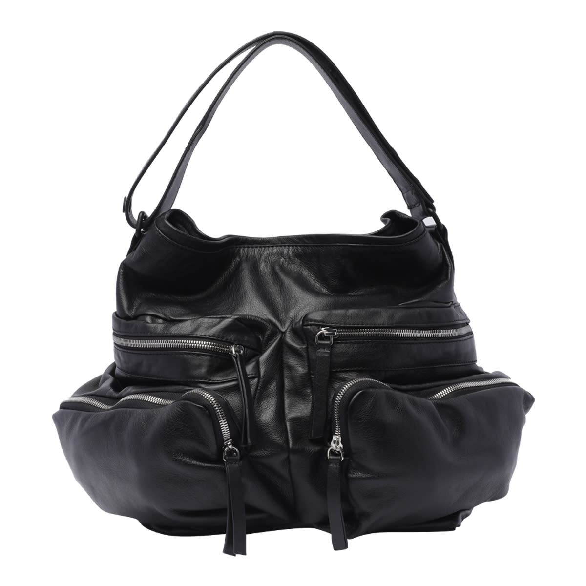 Vic Matie' black shoulder bag, clip closure, inner zipped pocket, 2 open pockets, 4 external zipped pockets, adaptable strapComposition: 100% Calf Leather
