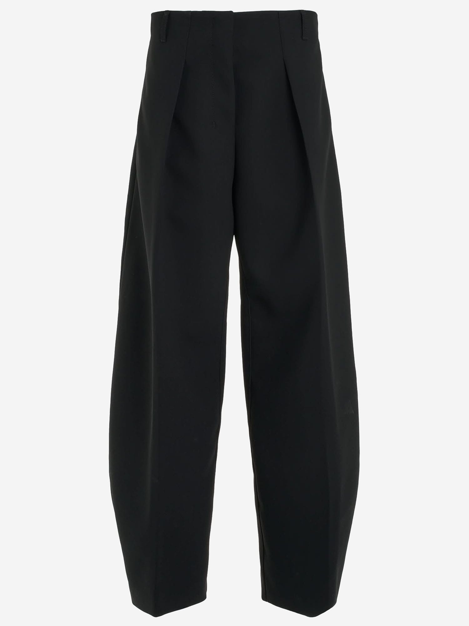 Trousers made of nylon High waist with belt loops Concealed zip and button fastening Two side pockets Back pocket with button Wide and curved fit Black Made in Bulgaria Composition: 100% polyester