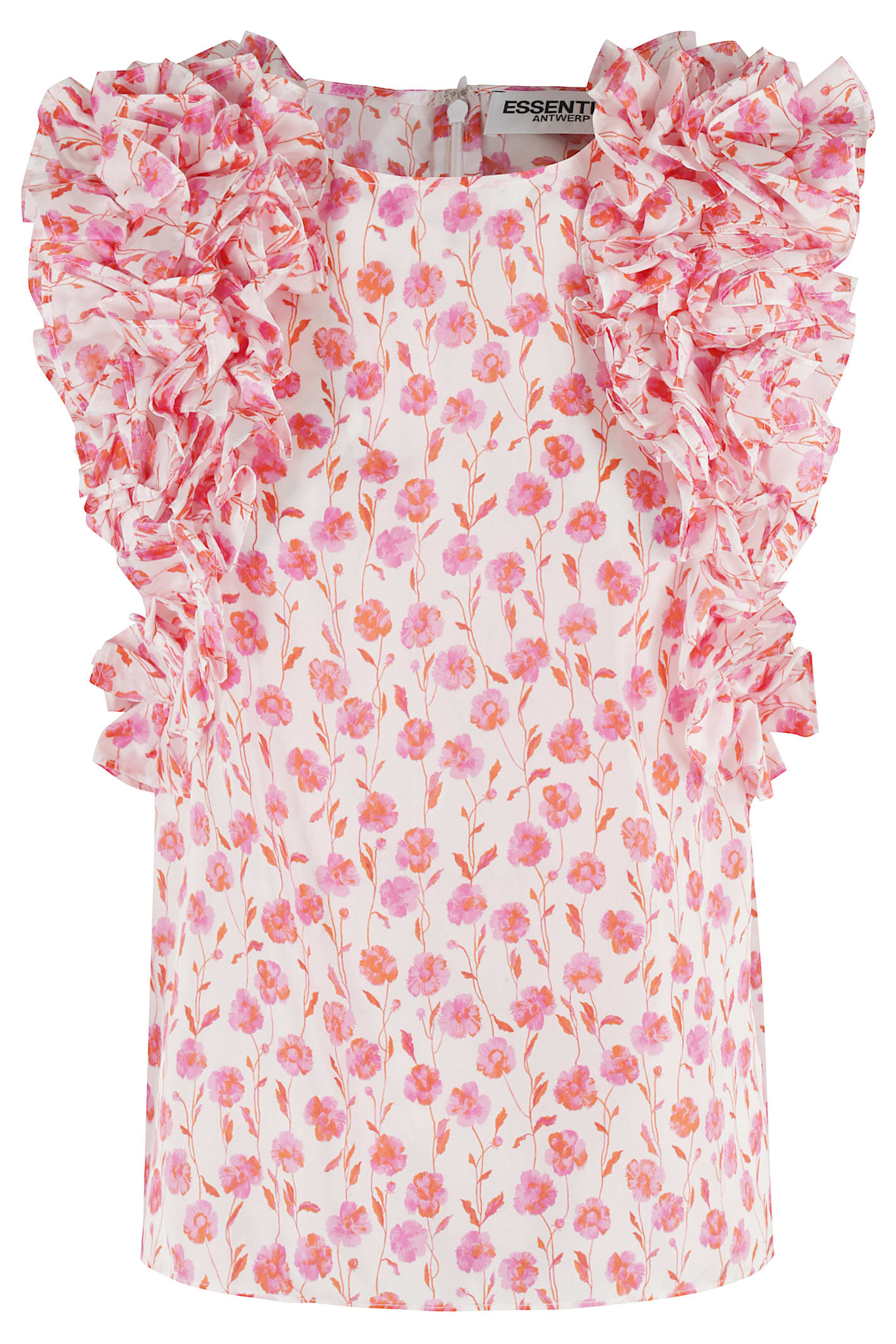 Honour Top - Essentiel Antwerp - Ivory and pink color - Silk fabric with floral print - Crew neck - Sleeveless with ruffle - Back zipper closure - Loose fit