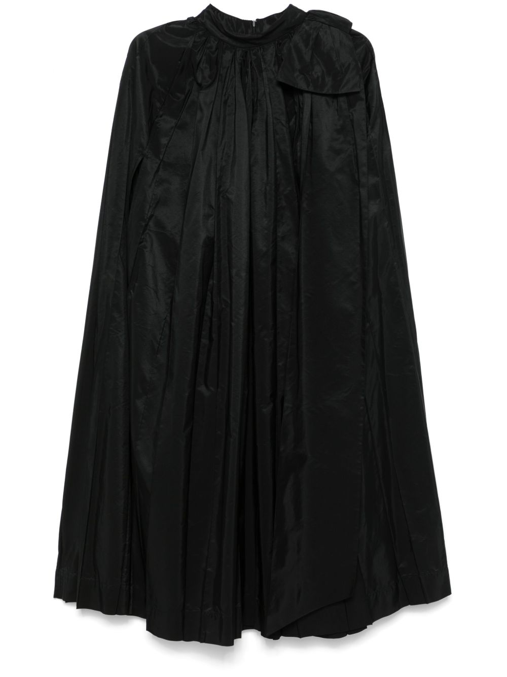 黑色 塔夫绸 领口褶饰细节 斗篷设计 背面隐藏式拉链 缩褶企领 肩部饰有超大蝴蝶结细节 腰带细节 袖窿 无衬里 平直下摆 中长
