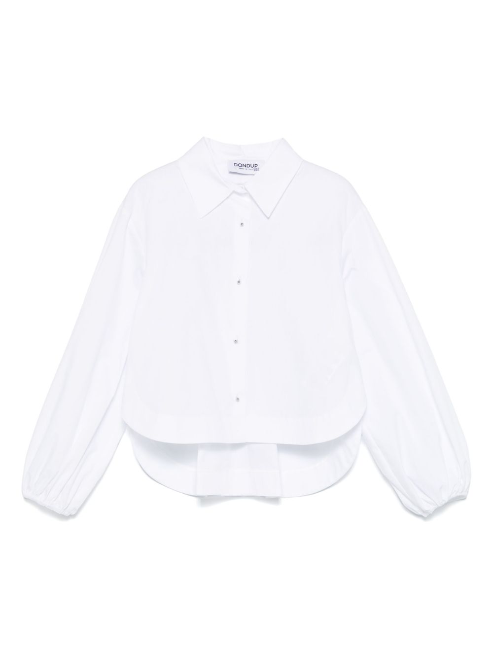 白色 棉 府绸质感 正面纽扣 尖头平翻领 长袖 弹性松紧边 弧形边