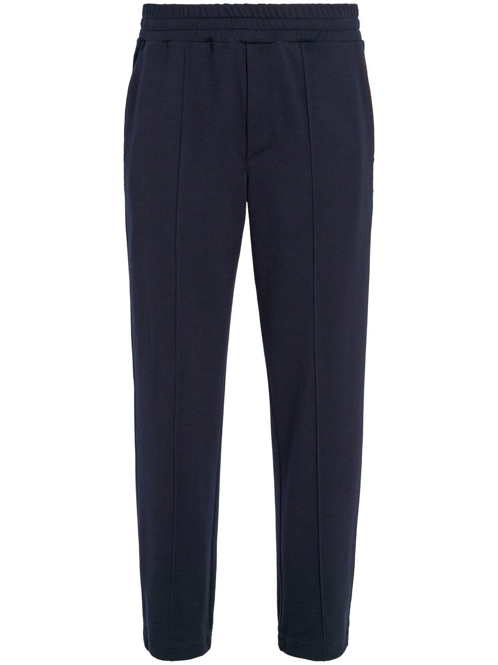 海军蓝色、弹性松紧腰边、压褶、两个侧置插袋、后置平袋、锥形裤腿。