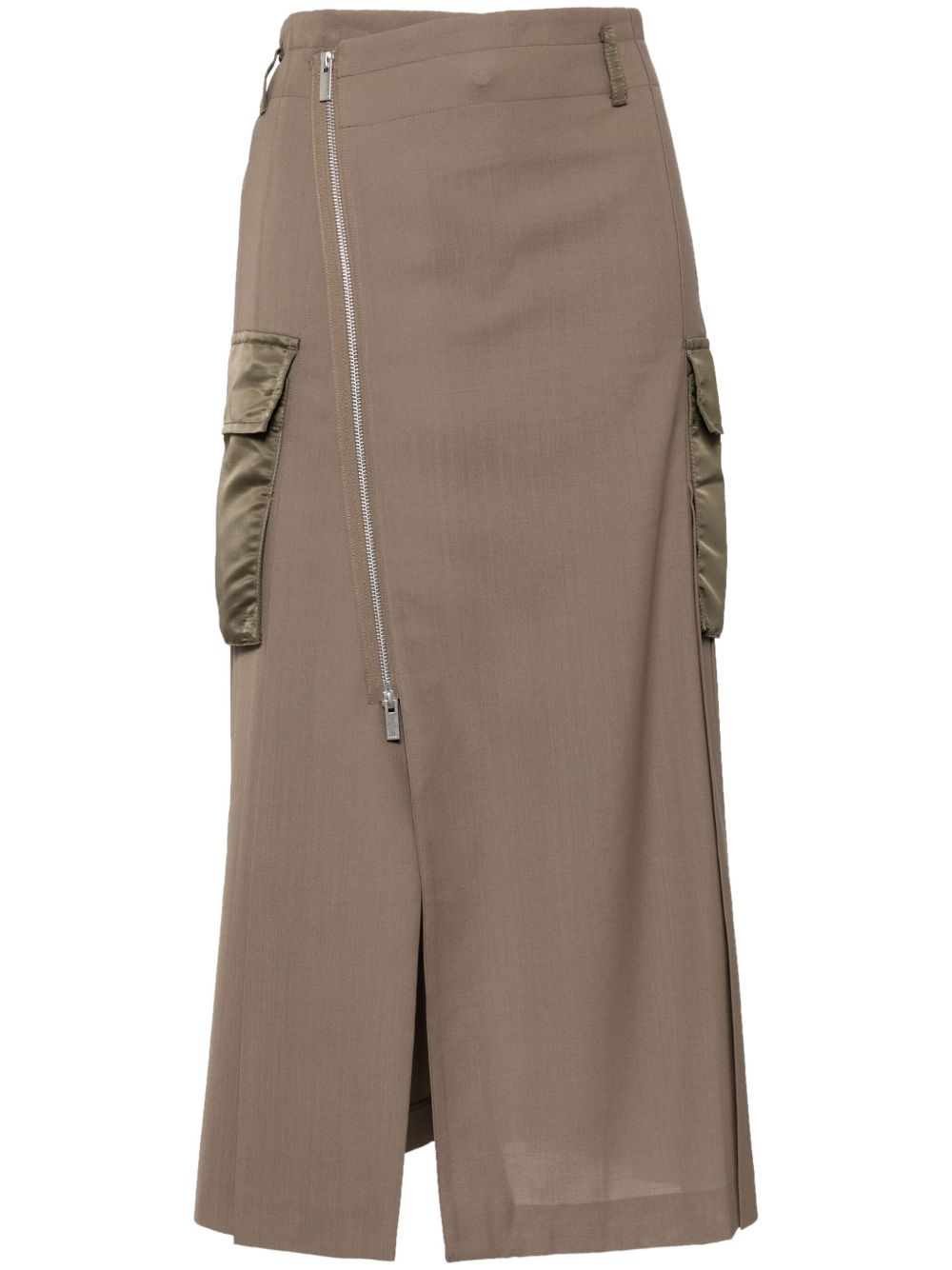 米色 府绸质感 褶饰细节 正面饰有拉链开合 背面弹性松紧腰边 腰带袢 两侧饰有盖袋