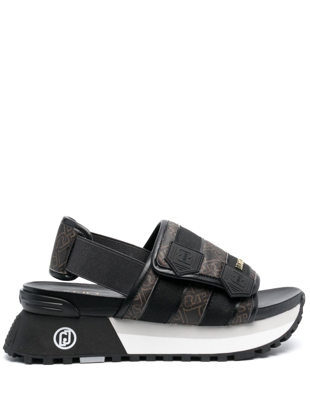 黑色、褐色、经典 logo 印花、正面饰有魔术贴、侧置凹面压花logo、金色logo标牌、露趾、搭扣踝带、鞋垫饰有标志、鞋底饰有logo、橡胶厚底。