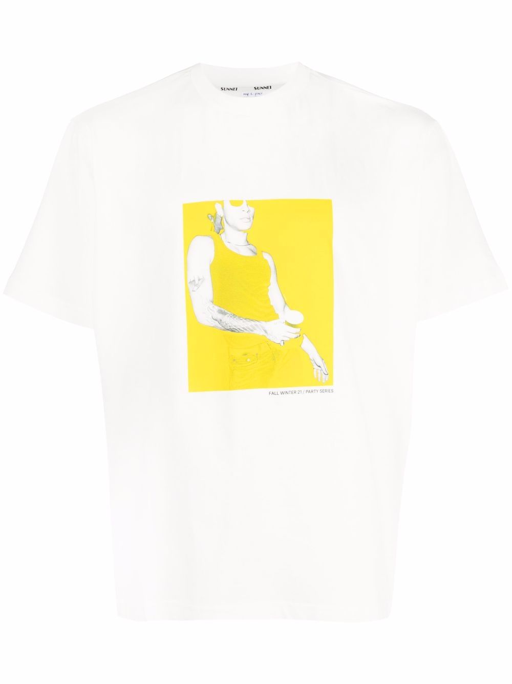 米白色/黄色 棉 照片印花 圆领 短袖 平直下摆 请注意,这款商品采用无性别风格,符合男装标准尺码。