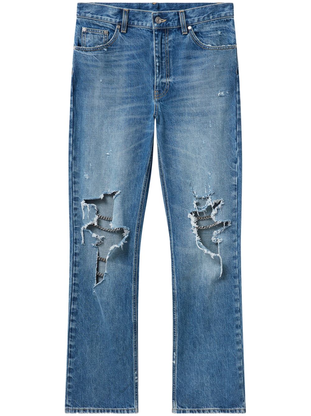 蓝色 棉 仿旧效果 链式细节 隐藏式拉链纽扣开合 腰带袢 经典五口袋 微喇
