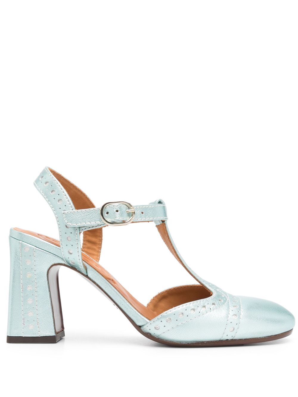 浅蓝色 搭扣袢带开合 粗高跟 皮质底 这款商品随附防尘袋。