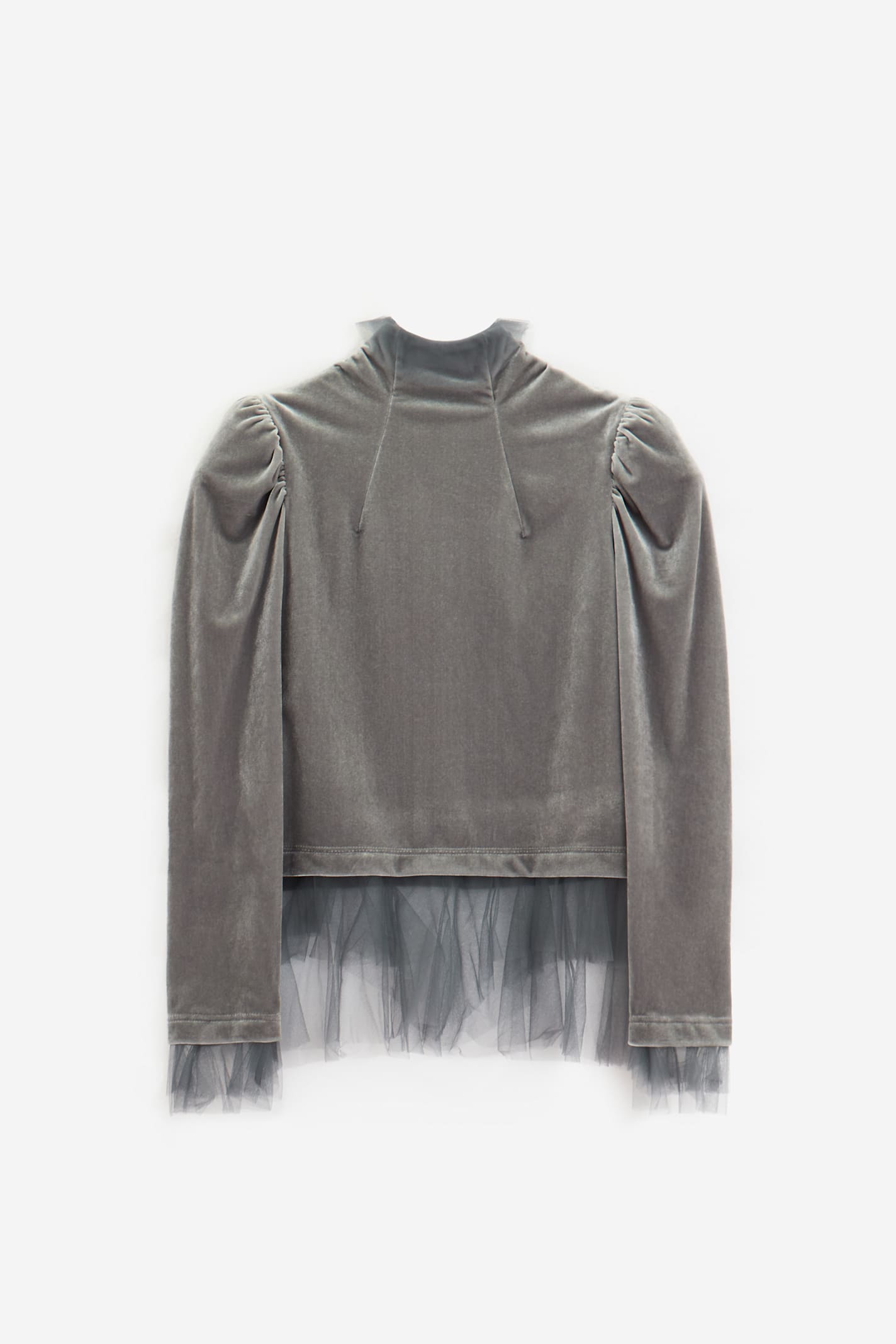 灰色聚酯纤维短款上衣,长袖,立体肩垫,背部拉链,直筒下摆
