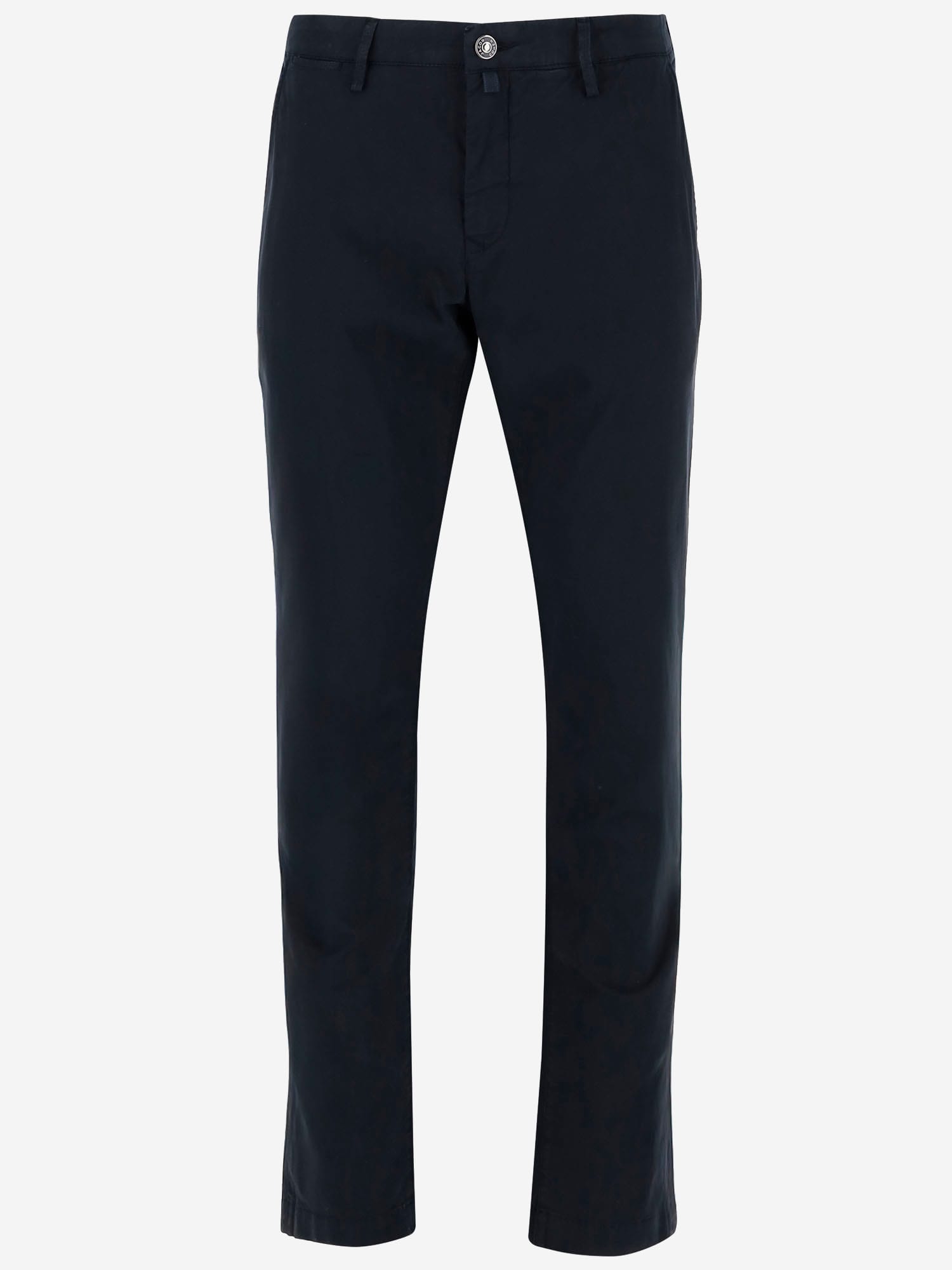 弹力棉直筒休闲裤 常规腰围带腰带袢,前拉链配纽扣门襟,两侧口袋,后腰两个贴袋及logo设计,藏青色,意大利制造,成分:97%棉,3%氨纶