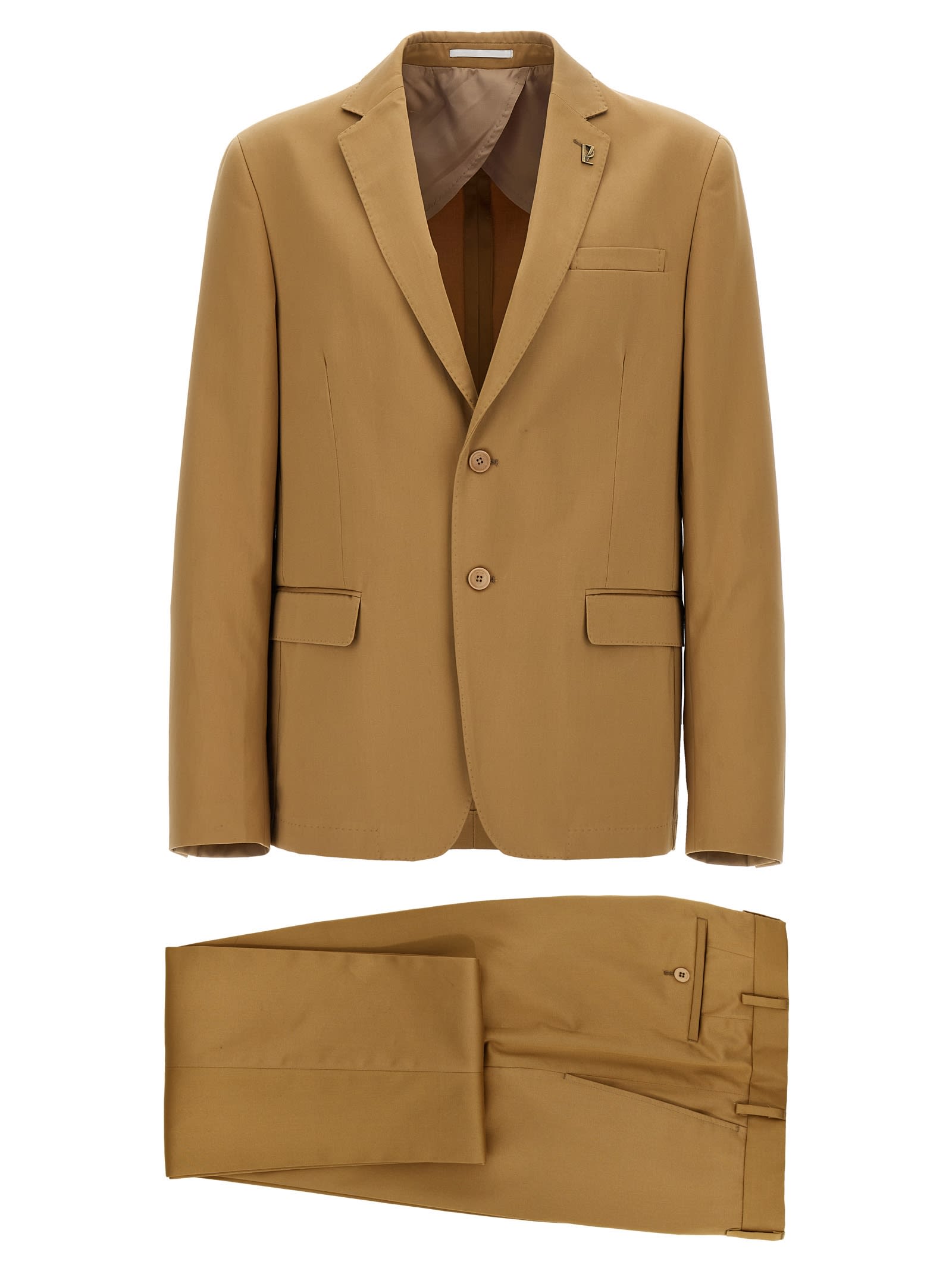 Baron' cotton dress consisting of a single-breasted deconstructed blazer with button closure, mirror lapels, breast pocket, flap pockets, half cupro lining, two inner pockets, buttonhole cuffs, back slits, removable metal logo brooch and ironed pleat pants, front pockets americane", back welt pockets, front zip and button closure, viscose lining. Composition: 100% cotton